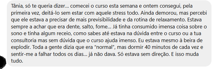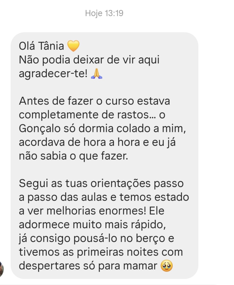 ⭐⭐⭐⭐⭐ "O M. passou a adormecer mais facilmente e o sono melhorou imenso. É incrível como pequenas mudanças fazem uma grande diferença!" — Sofia, mãe do Martim (6 meses)