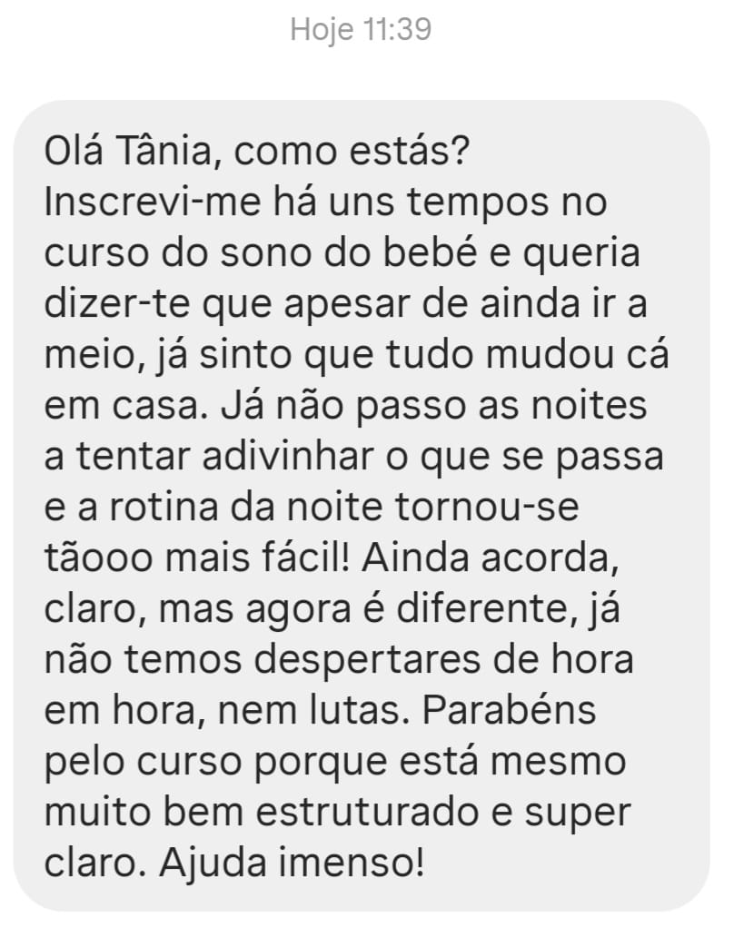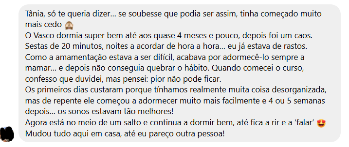 ⭐⭐⭐⭐⭐ "Aprender sobre janelas de vigília e relaxamentos foi uma mudança de jogo. Ter um passo a passo ajudou a criar uma boa base. Obrigada!" — Rita, mãe da Luísa (10 meses)